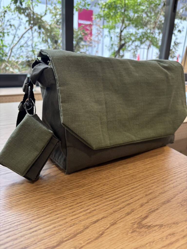 これはゼミでの個人展示の作品づくりをきっかけに始めました。最初はミシンの使い方も分からず、YouTubeで糸の通し方から学びました。久しぶりに小学校の家庭科を思い出しながら挑戦し、1回目は手持ちの服を組み合わせてバッグ・帽子・トップスの3点セットを制作。2回目は、いらなくなったズボンを布として再利用して、一からバッグを作りました。縫う順番を間違えて解き直したりもしながら、なんとか締め切りギリギリで完成。大変でしたが、完成したときの達成感はかなりのものでした。